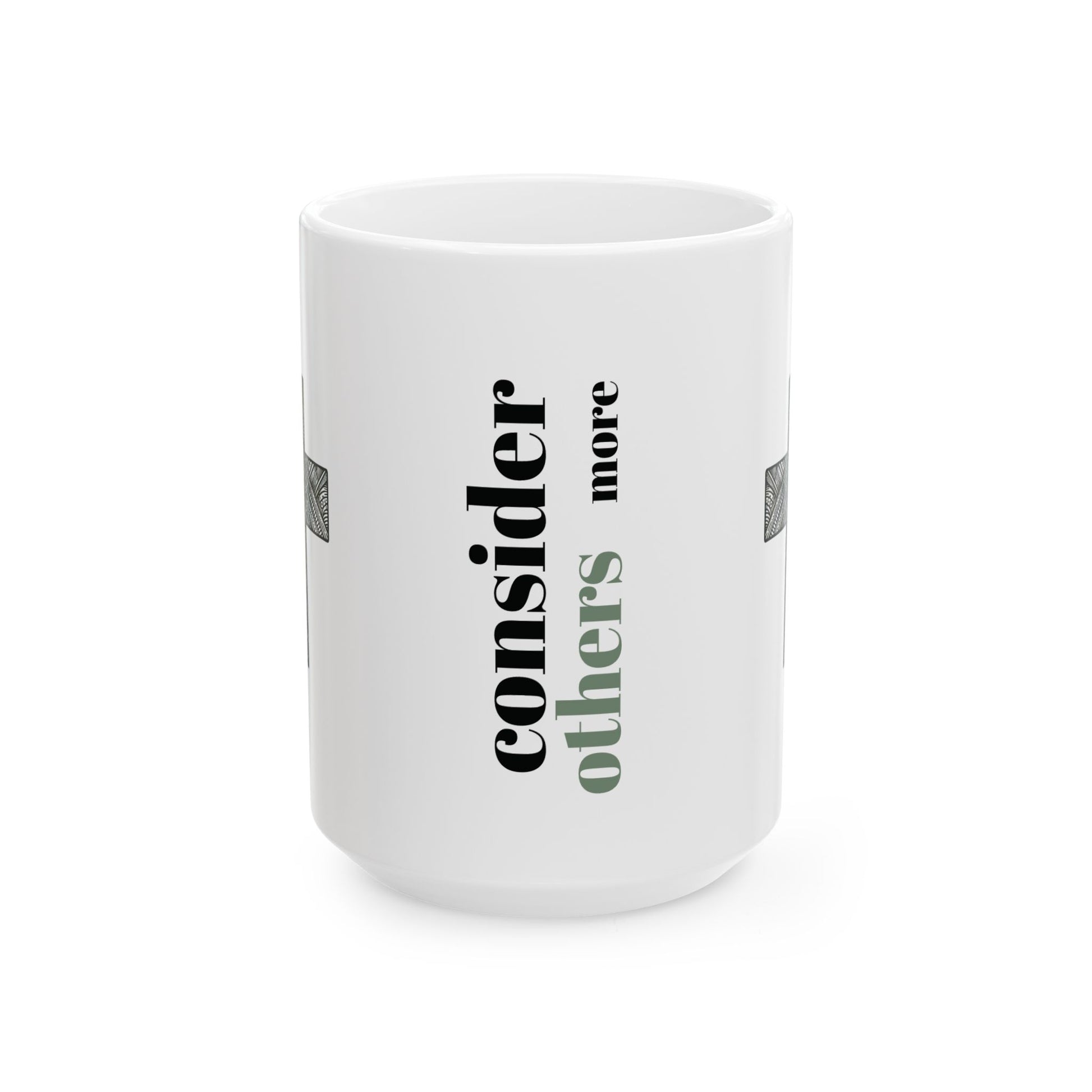A Christian-themed ceramic mug featuring a 'Consider Others More' statement along with a minimalistic design of a cross, perfect for daily use and as a thoughtful gift. This mug gives off a peaceful and reflective vibe, appealing to those who find strength in their faith. Ideal for morning coffee or tea, this mug is relevant for religious holidays, occasions, or as a reminder to prioritize others.