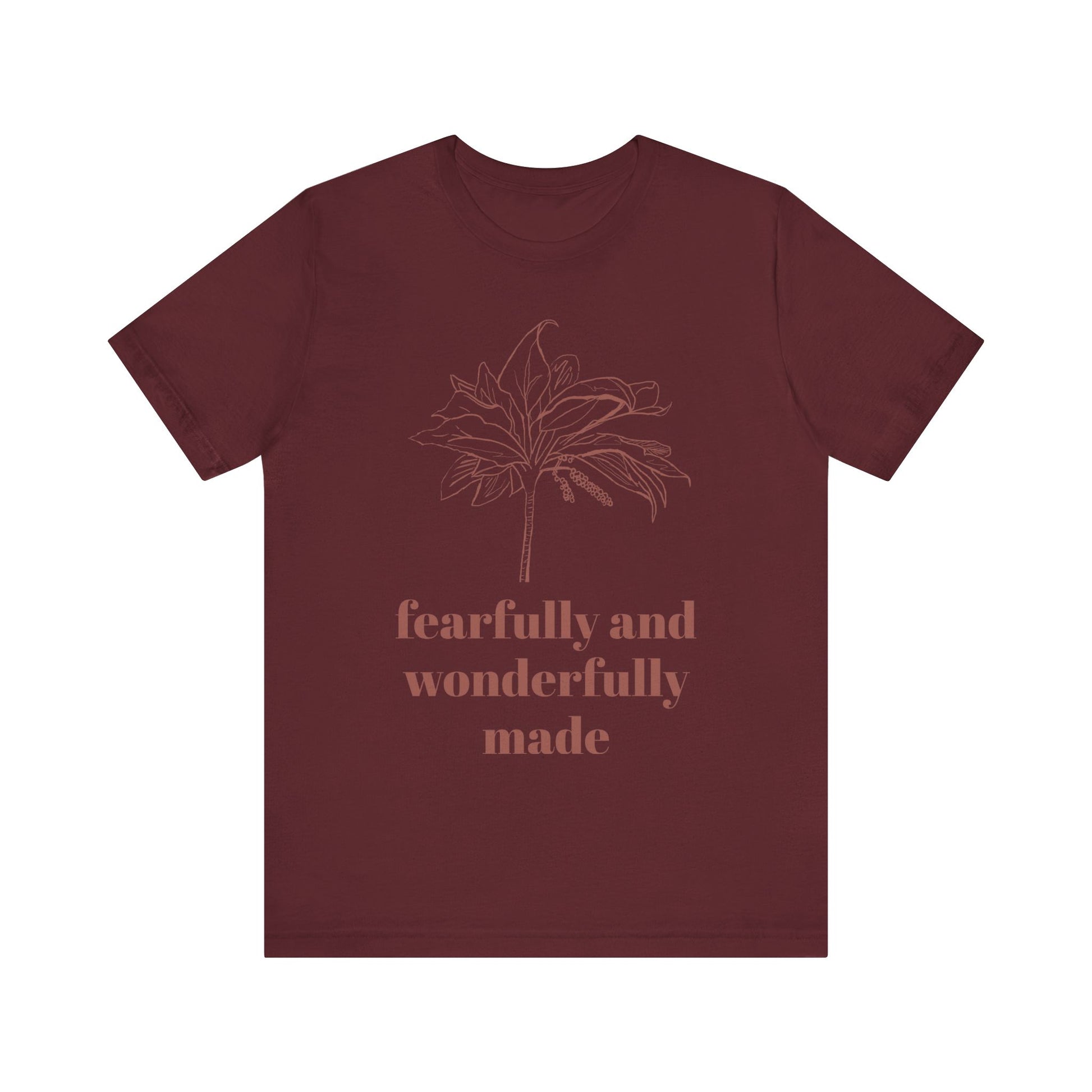 Introducing this stylish and comfortable Psalm 139-inspired Unisex Jersey Short Sleeve Tee. Crafted from 100% Airlume combed and ring-spun cotton, this tee is not only lightweight and breathable but also designed for active and leisure wear. The elegant design features a beautiful floral motif along with the uplifting phrase, 'fearfully and wonderfully made,' giving it a positive and empowering vibe. Perfect for casual outings or semi-formal occasions, this top effortlessly combines fashion with motivation.
