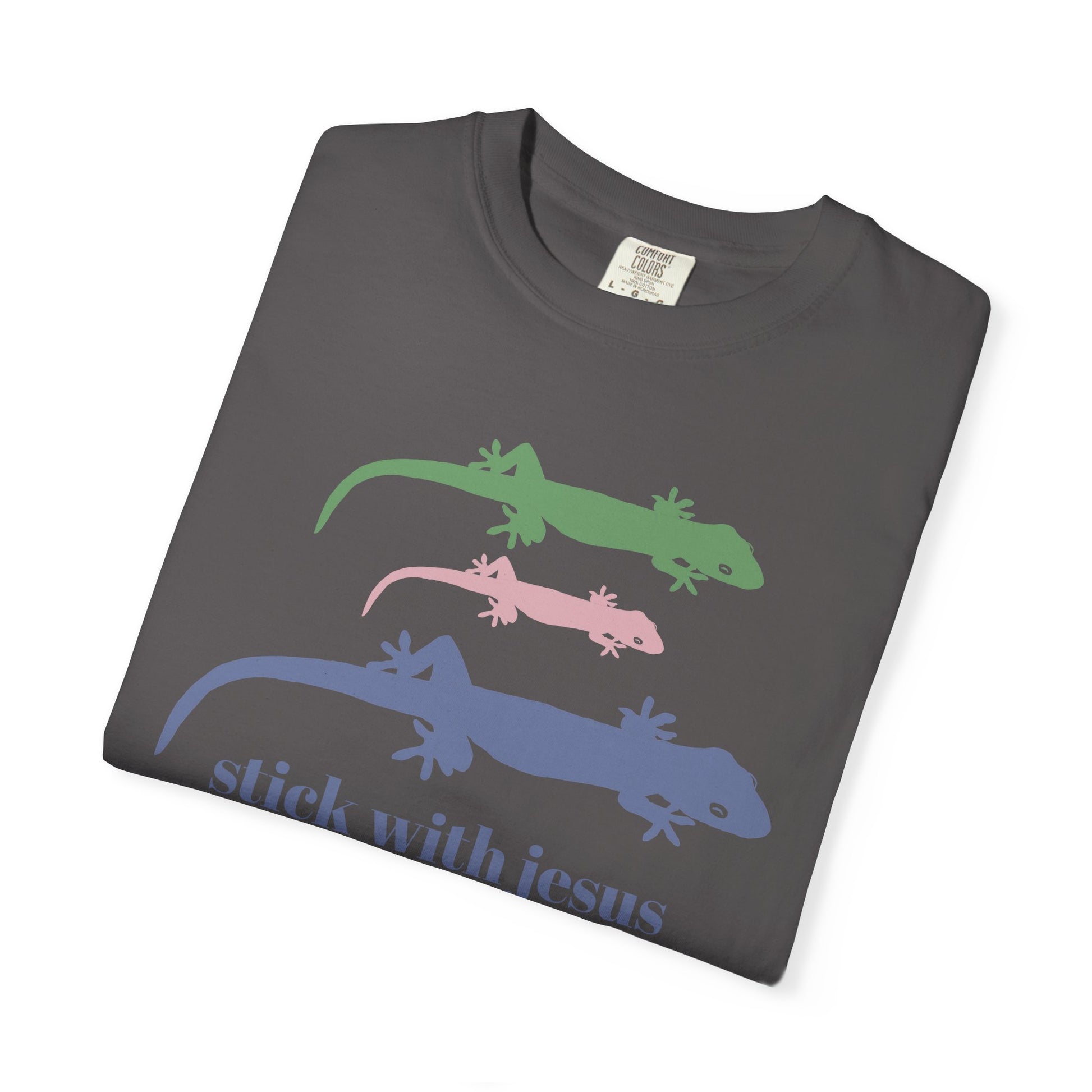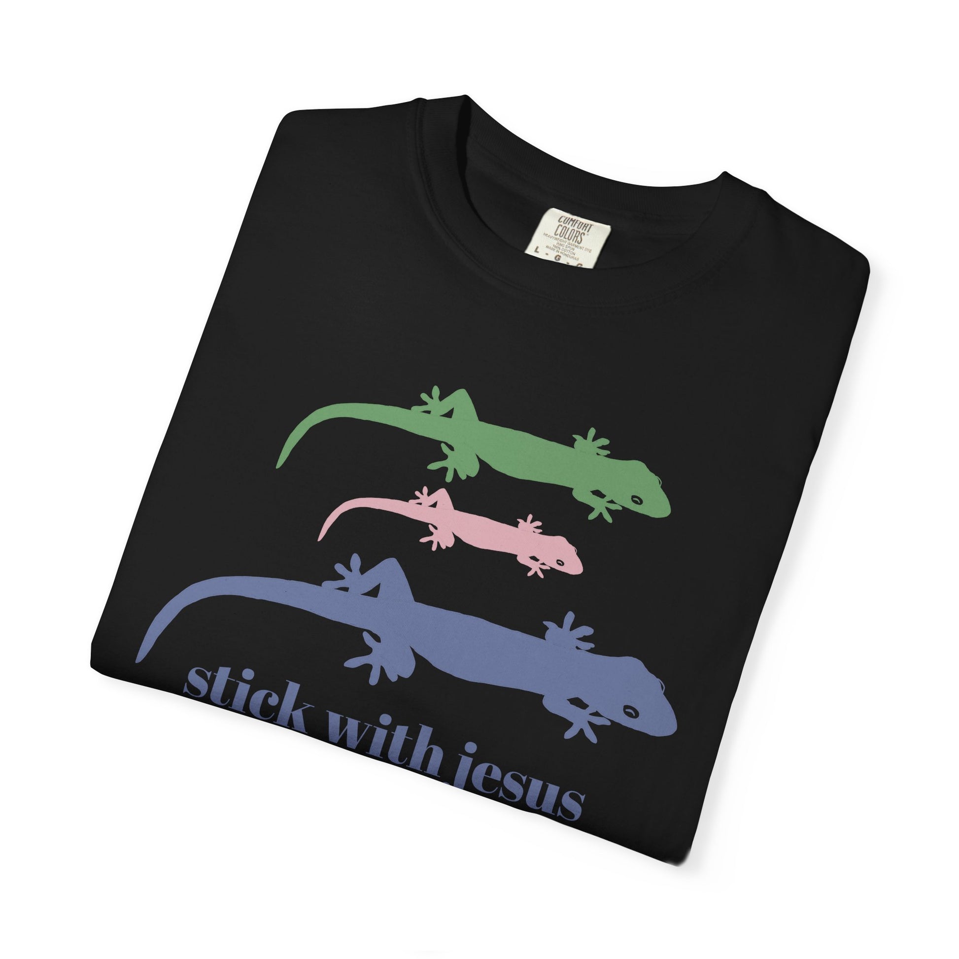 A Stick With Jesus gecko t-shirt that radiates a fun and positive vibe, perfect for Christian believers looking to express their faith in a playful way. This comfortable and versatile garment is ideal for everyday wear, casual gatherings, church events, and as a unique gift for religious holidays and celebrations.